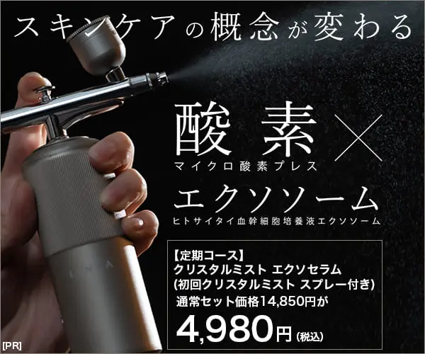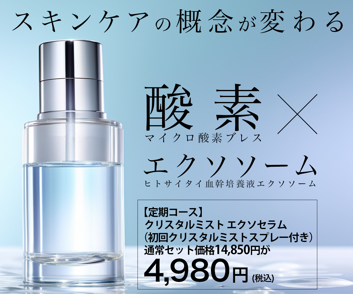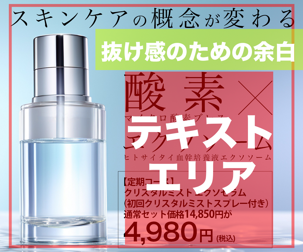 - 文言の優先順位としては、「①酸素×エクソソーム」 「②スキンケアの概念が変わる」 「③4,980円」 「④【定期コース】クリスタル〜」「⑤マイクロ酸素ブレス・ヒトサイタイ血幹培養液エクソソーム」と考える。「酸素×エクソソーム」「スキンケアの概念が変わる」という文言を目立たせることで、化粧品の特徴が一目で理解できるようになっている。